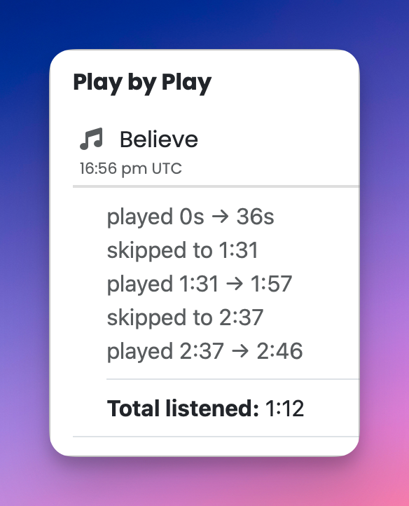 Our analytics now track every play as a sequence of real listener actions. Instead of abstract averages, you can see exactly what happened during each listen.
